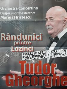 Cîntărețul și compozitorul Tudor Gheorghe va reveni pe scena Casei de Cultură din Suceava. Pe 20 aprilie, începînd cu ora 19.00, el va susține concertul „Rîndunici printre lozinci”. Biletele costă 90 de lei și pot fi cumpărate de la secretariatul Casei de Cultură. Elevii, studenții și pensionarii vor plăti 80 de lei pentru un bilet.