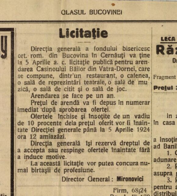 Și am mai citit ceva. Am citit un anunț apărut în anul 1924 în ziarul ”Glasul Bucovinei”: ”Licitație. Direcția generală a fondului bisericesc ort. rom. din Bucovina în Cernăuți va ține la 5 Aprilie a.c. licitație publică pentru arendarea Casinoului Băilor din Vatra Dornei, care se compune dintr-un restaurant, o cafenea, o sală de prezentări teatrale, o sală de muzică, o sală de citit și o sală de joc. (…) La această licitație vor putea concura numai birtașii de profesiune”. Scuzați, Înalt PreaPreoția Voastră, dar la mintea noastră, care nu este nici pe departe atît de plină de carte ca a Domniei Voastre, noi știm că la restaurant se mănîncă, se beau băuturi, inclusiv alcoolice, și se fumează țigări. La vremea aceea, cel puțin, se fuma în spații închise. Apoi, sală de joc înseamnă sală de jocuri, că doar lumea bună nu juca, adică nu bătea opinca la podea, ci valsa. Cît despre sala de muzică, evident că nu era pentru pop-rock, pentru că pe vrema aceea nu se inventase muzica asta. Cît despre birtași, aceștia se ocupă de birturi, locuri în care lumea bea băuturi alcoolice și fumează țigări.