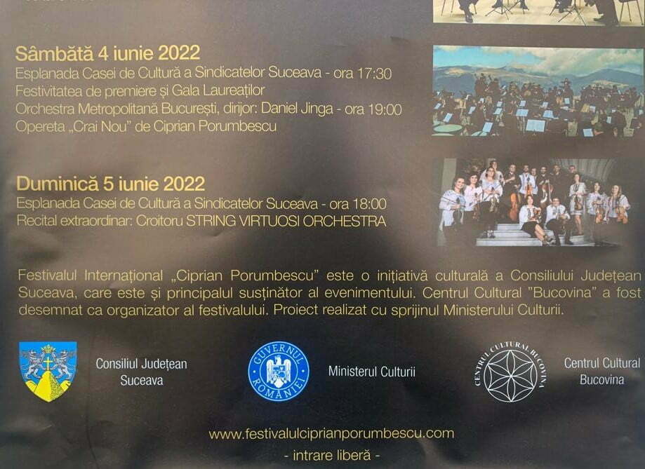 Este de apreciat agitația vicepreședintelui PNL al Consiliului Județean Suceava Niculai Barbă în ceea ce privește îmbogățirea agendei culturale a județului cu manifestări de marcă, în speranța că astfel va crește numărul de turiști. Să luăm, de pildă, Festivalul Internațional ”Ciprian Porumbescu”, programat să aibă loc zilele următoare. Ținta ambițioasă propusă de domnul Barbă este ca acest festival să rivalizeze cîndva cu respectabilul Festival ”George Enescu” din Capitală. Cam ambițioasă ținta, însă ca să realizezi ceva trebuie să-ți ridici ștacheta cît mai sus. Pentru a da greutate manifestării s-a căutat o colaborare cu Ministerul Culturii și s-a reușit. Asta și pentru că la vremea la care s-a căutat colaborarea ministru al Culturii era deputatul PNL de Suceava Bogdan Gheorghiu. Proiectul a fost făcut de Centrul Cultural Bucovina, instituție subordonată Consiliului Județean. A făcut-o acest centru pentru că fondurile pot fi atrase doar de operatori culturali. Și a apărut afișul. Și cine credeți că este moț pe afiș? Consiliul Județean, și nu Centrul Cultural Bucovina, instituția desemnată să deruleze proiectul. Are Consiliul Județean Suceava specialiști în domeniul cultural? Are, dar la Centrul Cultural Bucovina. Mîine-poimîine CJ-ul va da la o parte Muzeul Național al Bucovinei atunci cînd se vor face expoziții de artă, Salvamotnul, atunci cînd se vor organiza sesiuni de marcare a traseelor montane, și Direcția pentru Protecția Copilului, atunci cînd se vor alege asistenții maternali. De aia proiectele de drumuri, poduri, podețe și cotețe merg împiedicat în județul nostru: pentru că onor Consiliul Județean în loc să se ocupe de ele are grijă să se pună moț pe afișele manifestărilor culturale. Să cînte muzica! Să cînte Consiliul Județean!