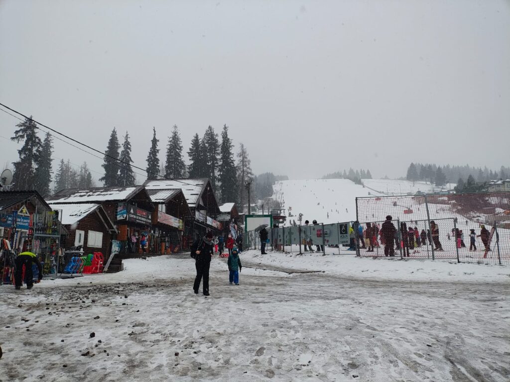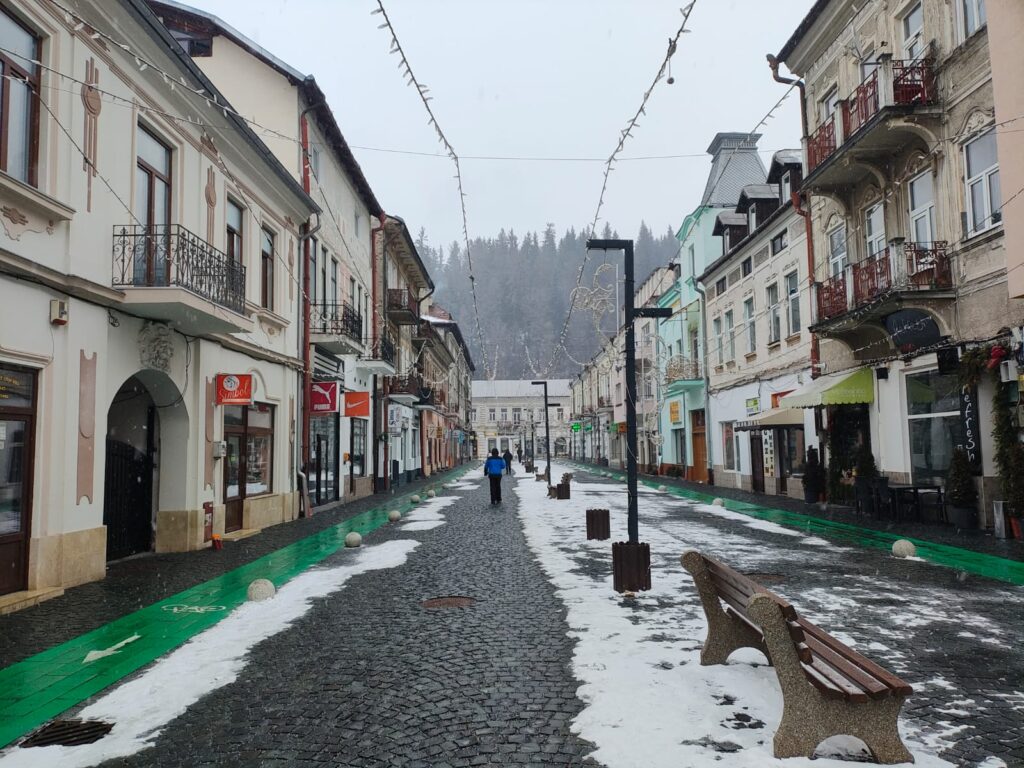 În contrast, pe pietonalul din centrul orașului bate vîntul, mai mult la figurat decît la propriu. Atmosfera veselă din jurul Cazinoului Băilor, din parc și de la pîrtie este în contrast cu atmosfera destul de tristă de pe espalanada unde cînd și cînd trece cîte un localnic însoțit de gîndurile sale și, eventual, de o plasă care a trecut pe la un magazin.