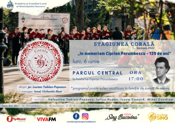 Astăzi, începînd cu ora 17.00, patru soliști ai Coralei mixte „Ciprian Porumbescu” a Asociației „Sing Bucovina” vor susține un recital la bustul lui Ciprian Porumbescu, amplasat în Parcul Central din Suceava. Programul poate suferi modificări în funcție de condițiile meteo. Concertul va fi dedicat comemorării a 139 de ani de la trecerea la cele veșnice a marelui compozitor, violonist și apărător al valorilor naționale Ciprian Porumbescu. Dirijorul coralei este preotul profesor Lucian Tablan-Popescu, iar cei patru soliști sînt Valentina Tablan-Popescu, Iulian Hodan, Ioana Camară și Mihai Candrea. Recitalul de astăzi face parte din proiectul „Stagiunea Corala – Suceava 2022” și se desfășoară în parteneriat cu Primăria și Consiliul Local. Managerul Coralei „Ciprian Porumbescu” este profesorul Ionuț-Vichentie Ilisoi.