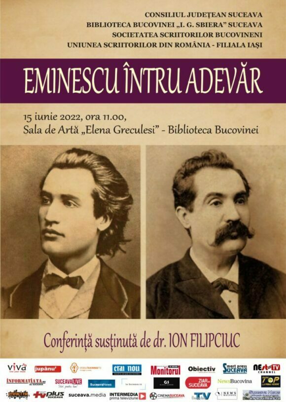Pe 15 iunie, de la ora 11.00, la Biblioteca Bucovinei „I. G. Sbiera” din Suceava este programată conferința „Eminescu întru adevăr”. La acea dată se împlinesc 133 de ani de la moartea marelui poet. Conferința va fi susținută de eminescologul cîmpulungean Ion Filipciuc. Moderatorul evenimentului va fi președintele Societății Scriitorilor Bucovineni, poetul Alexandru Ovidiu Vintilă.