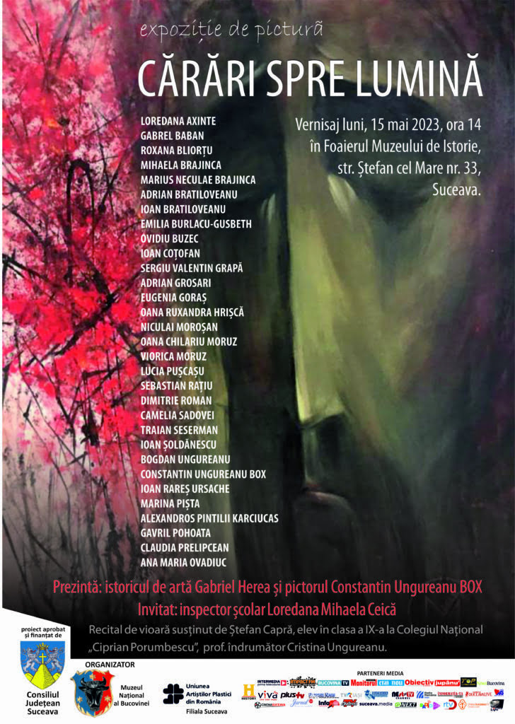 Luni 15 mai, începînd cu ora 14.00, la Muzeul de Istorie din Suceava se va desfășura vernisajul expoziției de pictură <Cărări spre lumină>. Lucrările sînt semnate de membri ai filialei Uniunii Artiștilor Plastici, iar la vernisaj vor vorbi istoricul de artă Gabriel Herea, pictorul Constantin Ungureanu BOX și inspectorul școlar de arte Loredana Ceică. La finalul evenimentului va avea loc un recital de vioară susținut de Ștefan Capră, elev în clasa a IX-a la Colegiul Național „Ciprian Porumbescu”. Profesorul său îndrumător este Cristina Ungureanu. Expoziția <Cărări spre lumină> va putea fi vizitată pe pînă la sfîrșitul lunii mai.