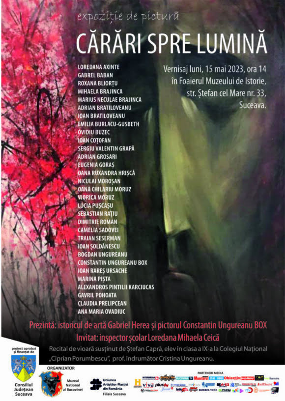 Luni 15 mai, începînd cu ora 14.00, la Muzeul de Istorie din Suceava se va desfășura vernisajul expoziției de pictură <Cărări spre lumină>. Lucrările sînt semnate de membri ai filialei Uniunii Artiștilor Plastici, iar la vernisaj vor vorbi istoricul de artă Gabriel Herea, pictorul Constantin Ungureanu BOX și inspectorul școlar de arte Loredana Ceică. La finalul evenimentului va avea loc un recital de vioară susținut de Ștefan Capră, elev în clasa a IX-a la Colegiul Național „Ciprian Porumbescu”. Profesorul său îndrumător este Cristina Ungureanu. Expoziția <Cărări spre lumină> va putea fi vizitată pe pînă la sfîrșitul lunii mai.