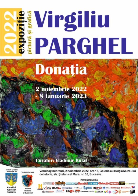 În perioada 2 noiembrie – 8 ianuarie, la Muzeul de Istorie din Suceava va putea fi vizitată gratuit expoziția de pictură și grafică <Donația>, semnată de Virgiliu Parghel. Vernisajul va avea loc miercuri, 2 noiembrie, de la ora 13.00, iar cu această ocazie va fi lansat și catalogul-album al expoziției. Catalogul reproduce fotografic toate cele 97 de lucrări de pictură și grafică pe care Virgiliu Parghel le-a donat sucevenilor, prin tezaurizarea lor în Colecția de Artă a Muzeului Național al Bucovinei. Criticul de artă Vladimir Bulat va susține un discurs despre opera și viața pictorului Virgiliu Parghel. Directorul Muzeului Național al Bucovinei, Emil Ursu, a afirmat: „Expoziția pe care o deschidem la Suceava în 2 noiembrie este una istorică: este o expoziție donație, lucru inedit; ilustrează istoria evoluției unui artist, cu perioadele sale majore de creație, cu zbaterile sale, cu temele sale predilecte – portretul, icoana, peisajul rural (mai rar urban) și natura statică (unde regăsim numeroase elemente etnografice), toate vorbind, după părerea noastră, de încercări de regăsire a artistului prin întoarcerea la valorile lui esențiale – lumile bisericii, a vechiului sat sau propriului Eu, de accedere la Lumină”.