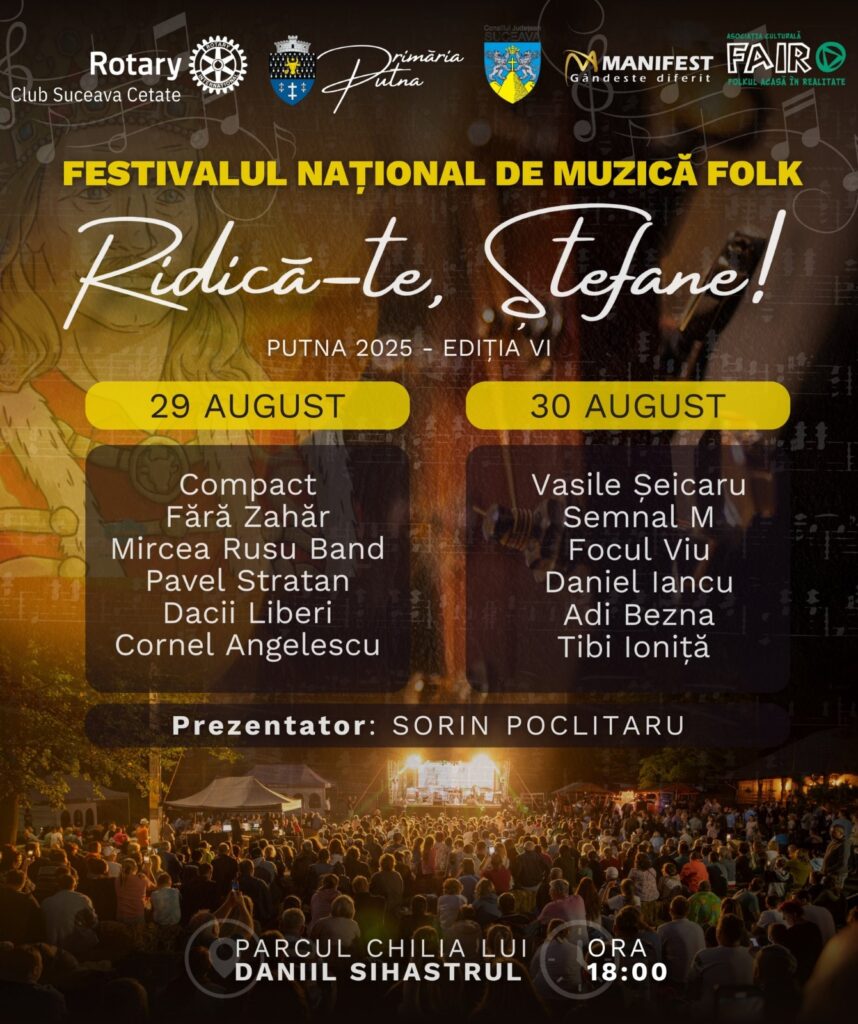 Ediția a VI-a a Festivalului de muzică folk ”Ridică-te Ștefane” va avea loc pe 29 și 30 august 2025. Festivalul are loc în parcul ”Chilia lui Daniil Sihastrul”.