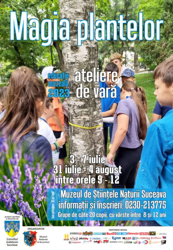 În perioadele 3 – 7 iulie și 31 iulie – 4 august, în intervalele orare 09.00-12.00, la Muzeul de Științele Naturii din Suceava se va derula proiectul educațional „Magia plantelor”. Muzeul Național al Bucovinei a comunicat că în fiecare serie se pot înscrie maximum 20 de copii cu vîrste cuprinse între 8 și 12 ani. Taxa de participare este de 20 lei/copil. În cadrul atelierului, copiii vor învăța despre plante și animale de pe mapamond, vor determina tipurile de copaci din parc și vor presa flori și frunze. Plantele vor fi folosite pentru realizarea de mici tablouri, brelocuri și semne de carte. De asemenea, copiii vor învăța cum se realizează un ierbar. Înscrierile se fac la numărul de telefon 0230/213775 sau la standul muzeului.