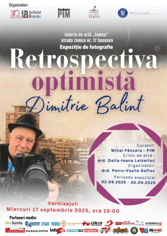 Galeria de Artă <Zamca> anunță că găzduiește expoziția aniversară <Retrospectiva optimistă>, dedicată împlinirii vîrstei de 95 de ani a maestrului fotograf Dimitrie Balint, pînă pe 30 septembrie 2025. Vernisajul expoziției va avea loc pe 17 septembrie, de la ora 15.00, iar curatorul acesteia va fi Maestrul Mihai Pînzaru – PIM. ”Vă invităm să fiți alături de noi la acest eveniment aniversar și să celebrați prin artă cei 95 de ani ai lui Dimitrie Balint – un model de vitalitate și inspirație”, îndeamnă instituția.