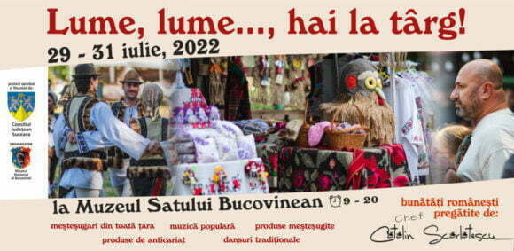 Peste 70 de meșteri populari și expozanți vor fi prezenți la ediția 2022 a manifestării <Lume, lume…hai la tîrg!>,care va avea loc în perioada 29-31 iulie, la Muzeul Satului Bucovinean din Suceava. Tîrgul va fi deschis în intervalul orar 09.00-20.00. Vicepreședintele Consiliului Județean Niculai Barbă a declarat că în fiecare zi vor fi spectacole susținute de Ansamblul Artistic Profesionist <Ciprian Porumbescu>, iar chef Cătălin Scărlătescu va face demonstrații de artă culinară. El este de părere că la tîrgul de la Muzeul Satului Bucovinean va participa un public numeros.