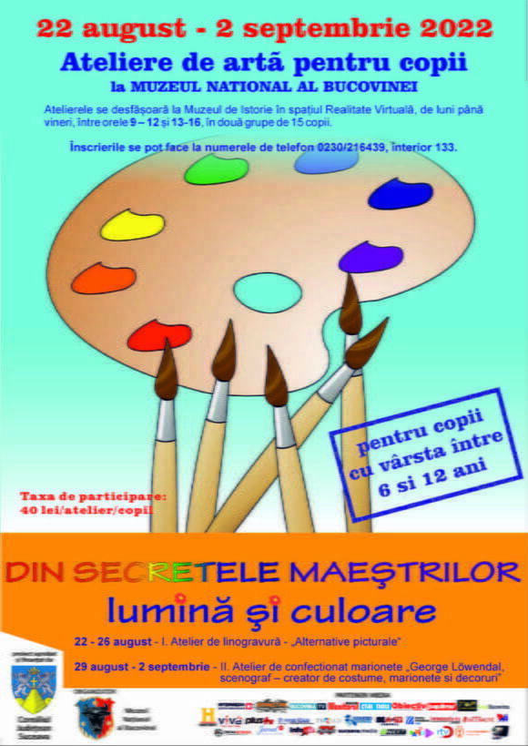 În cadrul proiectului „Din secretele maeștrilor – lumină și culoare”, în perioada 22 august – 2 septembrie, Muzeul Național al Bucovinei va organiza două ateliere de artă. Astfel, între 22 și 26 august se va desfășura atelierul de linogravură „Alternative picturale”, iar între 29 august și 2 septembrie este programat atelierul de confecționat marionete „George Löwendal, scenograf – creator de costume, marionete și decoruri”. Activitățile se adresează copiilor cuprinse între 6 și 14 ani și vor avea loc la Muzeul de Istorie de luni pînă vineri, în intervalele orare 09.00 – 12.00 și 13.00-16.00. Vor fi două grupe formate din cîte 15 copii. Muzeul Național al Bucovinei va asigura materialele necesare și lectori de specialitate. Înscrierile se fac la sediul Muzeului de Istorie pînă pe 19 august prin completarea unei fișe și achitarea taxei de participare în valoare de 40 de lei. Informații suplimentare pot fi obținute la numărul de telefon 0230/216439, interior 133.