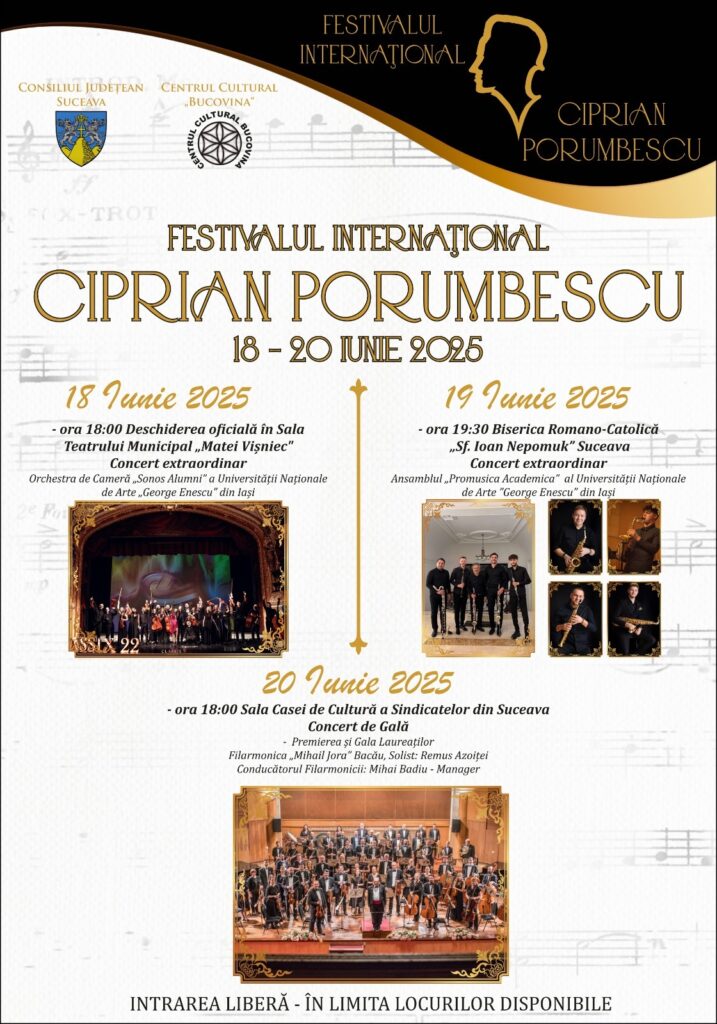 Consiliul Județean Suceava anunță că cea de-a IV-a ediție a Festivalului Internațional „Ciprian Porumbescu” se va desfășura în zilele de 18, 19 și 20 iunie.