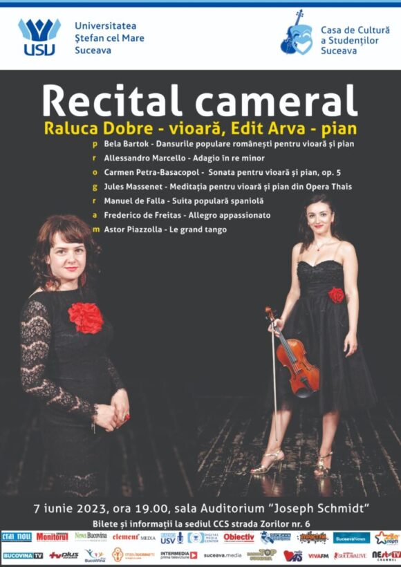 Miercuri, 7 iunie, începînd cu ora 19.00, în sala Auditorium „Joseph Schmidt” a Universității „Ștefan cel Mare” din Suceava va avea loc un concert cameral extraordinar susținut de Raluca Ioniță-Dobre, la vioară, și Edit Mihaela Arva, la pian. Ambele sînt profesoare la Universitatea Națională de Arte „George Enescu” din Iași. Programul va cuprinde lucrări de Astor Piazzolla, un renumit compozitor de tangouri argentiniene, și o suită de cîntece populare spaniole pentru pian și vioară ale compozitorului Manuel de Falla. Concertul cameral este organizat de Casa de Cultură a Studenților din Suceava.