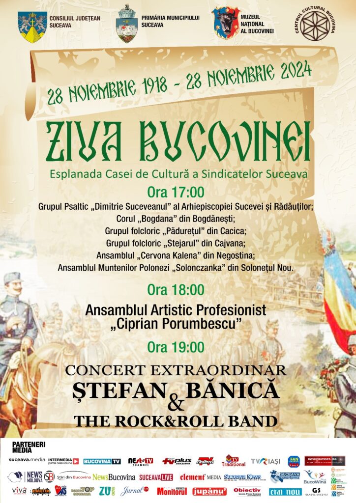 Primăria Suceava și Consiliul Județean organizează o serie de concerte pe 28 noiembrie, de Ziua Bucovinei.
