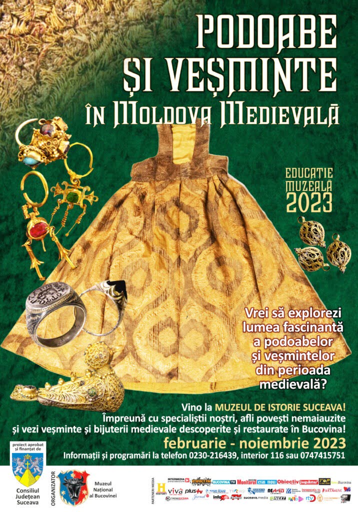 Muzeul Național al Bucovinei continuă proiectul de educație muzeală „Podoabe şi veşminte în Moldova medievală”. Cadrele didactice sînt invitate să sune la numărul de telefon 0230-216439, interior 116, sau la cel al muzeografului responsabil de program, 0747-415751, unde vor primi informații despre proiect, modalitatea de înscriere și data programată. Participarea se face în baza biletului de vizitare a Muzeului de Istorie, acolo unde se derulează proiectul. Ghidați de specialiști, participanţii au ocazia să descopere piese vestimentare şi podoabe, specifice perioadei medievale: rochie, cămaşă, marame, bonete, pantofi, brîie, anterie colorate, dar şi ace de păr şi de voal, inele şi cercei, reprezentînd importante izvoare istorice care au stat la baza studiilor despre evoluția vestimentației în Moldova. Piesele vestimentare şi podoabele au fost descoperite de-a lungul timpului în urma cercetărilor arheologice sistematice în morminte de la bisericile Sf. Ioan Botezătorul din Siret și Mirăuți din Suceava, Mănăstirea Probota și Biserica „Sfîntul Nicolae” din Bălineşti – Grămești, şi se încadrează în două mari categorii: veşminte, dar şi obiecte care ţin de ritualul funerar. Veşmintele şi podoabele prezentate sînt încadrate cronologic în perioada secolelor XV-XVII.