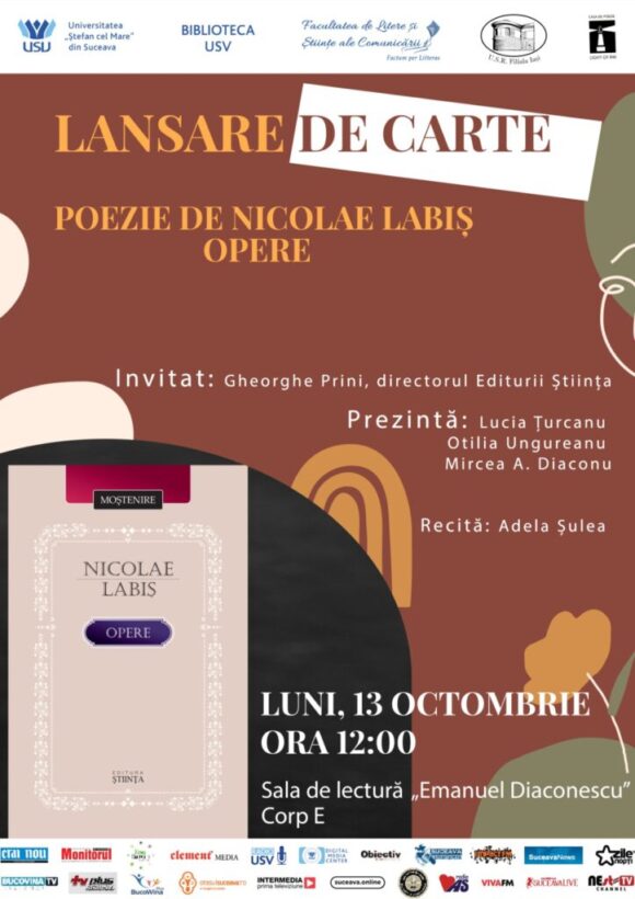 Luni, 13 octombrie a.c., de la ora 12.00, Biblioteca Universității „Ștefan cel Mare” Suceava va organiza în Sala de lectură „Emanuel Diaconescu” din corpul E lansarea volumului ”Nicolae Labiș. Opere”, apărut la Editura Știința din Chișinău.